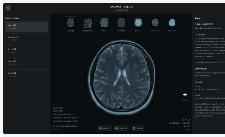 Images are instantly accessible via a DICOM viewer within the platform. All of the patient's available imaging across institutions is displayed within the viewer.