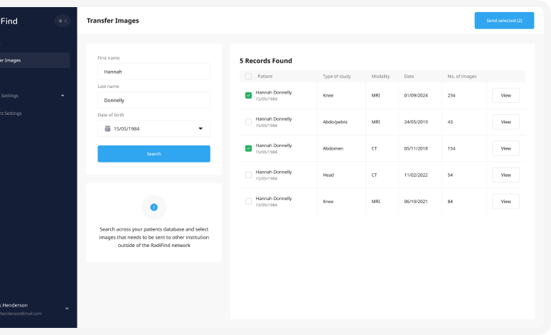 Easily transfer DICOM images between clinics within and outside the RadiFind network. External transfers are handled securely, with encrypted transmission and temporary access links.
